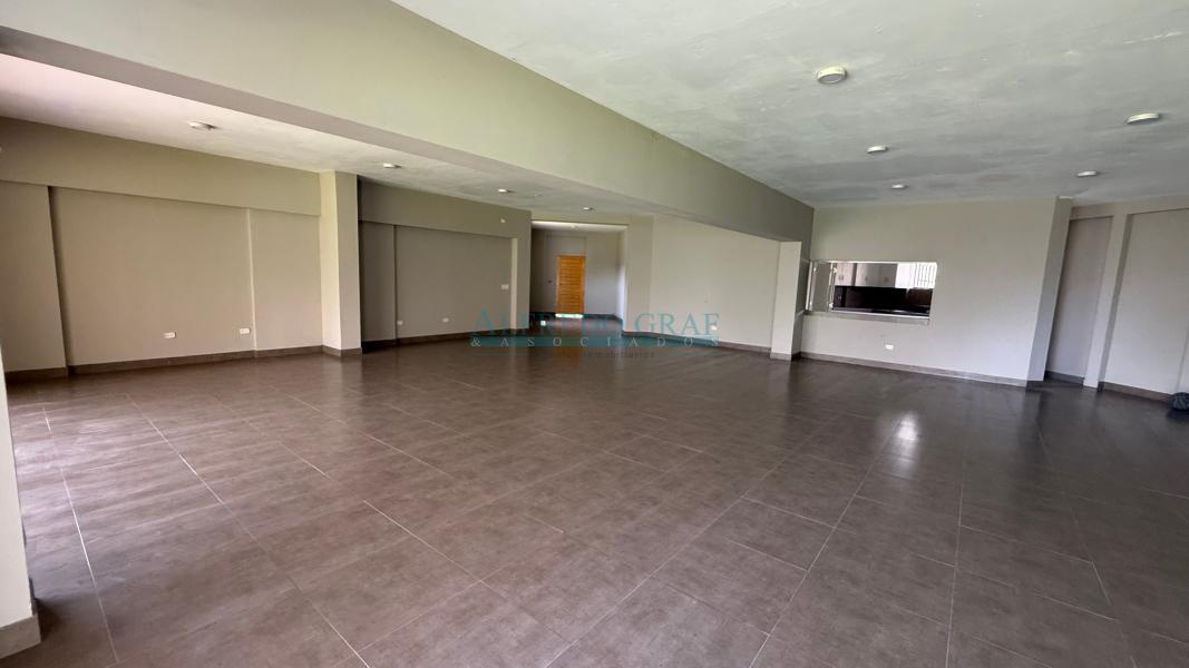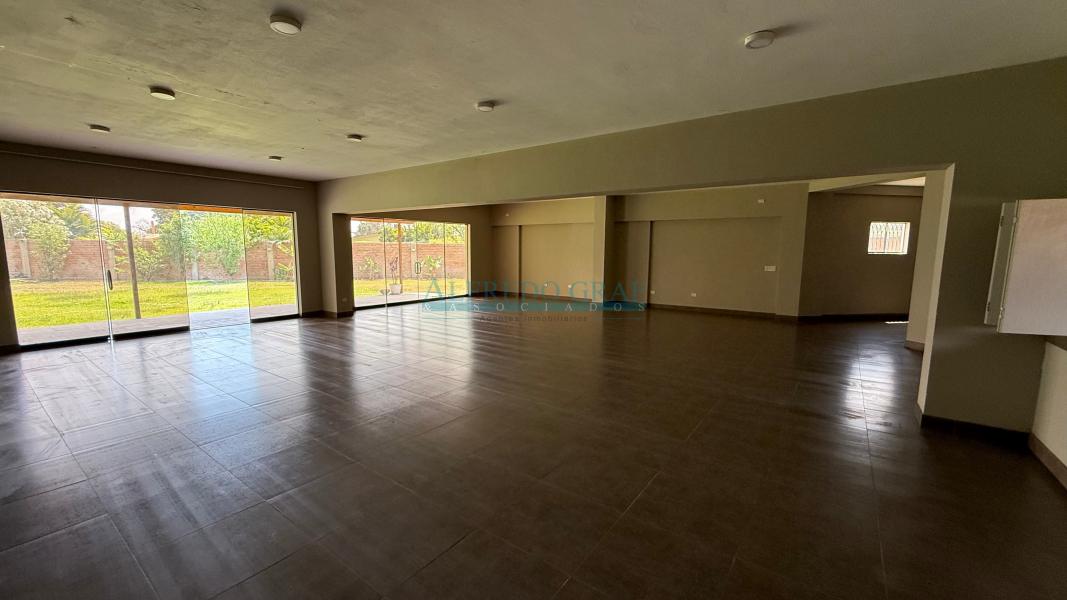 Primer nivel: salón amplio con vista a jardines y piscina, cocina, batería de baños para caballeros y damas.