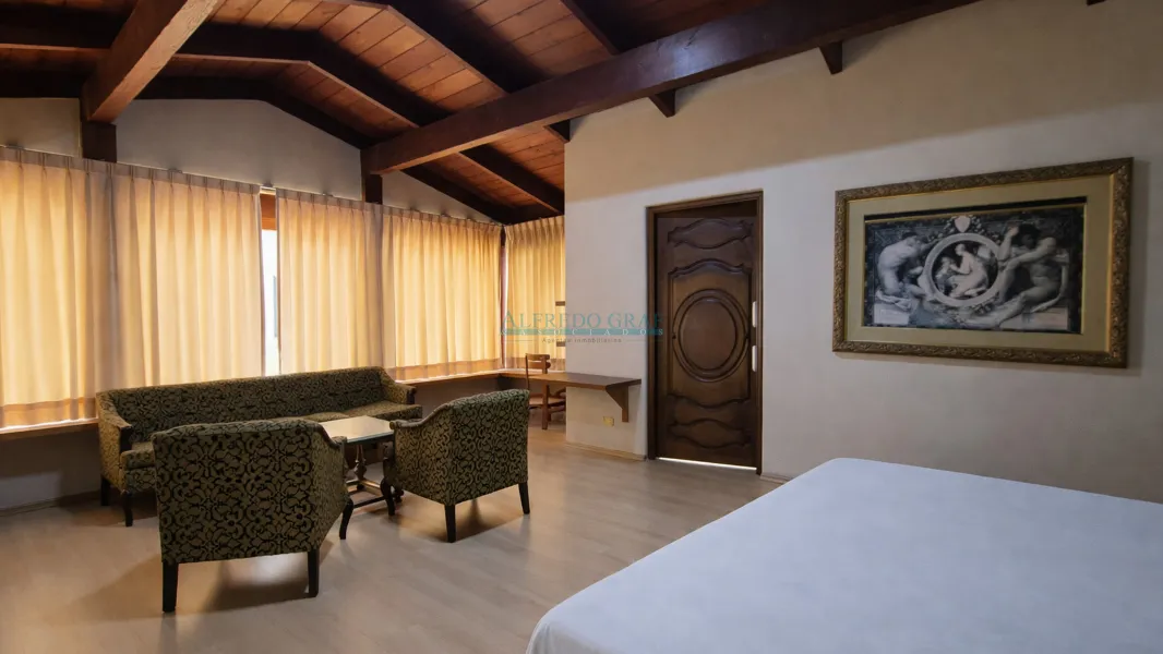 La propiedad cuenta con una casa principal de dos niveles, que ofrece amplios ambientes sociales con sala y chimenea, comedor, cocina equipada y dormitorios con baño. El dormitorio principal se encuentra en el segundo nivel, brindando mayor privacidad.